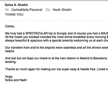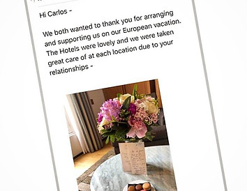 "... Hi Carlos - We both wanted to thank you for arranging and supporting us on our European vacation. The Hotels were lovely and we were taken great care of at each location due to your relationships - Thank you for your oversight, guidance, responsiveness and patience! ;-) We will be in touch….. Warmly,..."