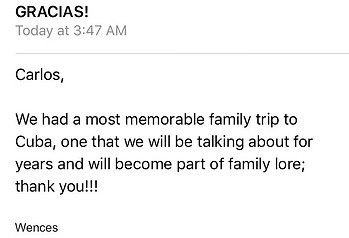 "... Carlos, We had a most memorable family trip to Cuba, one that we will be talking for years and will become part of family lore. Thank You!!! Wences. .."
