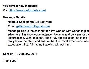 "...This is the second time I've worked with Carlos to plan a fantastic adventure! His knowledge, attention to detail and concern for the client are unsurpassed. What makes Carlos truly special is that he takes the time to really know the client and ensure that the travel experience meets every expectation. I can't imagine traveling without him..,"